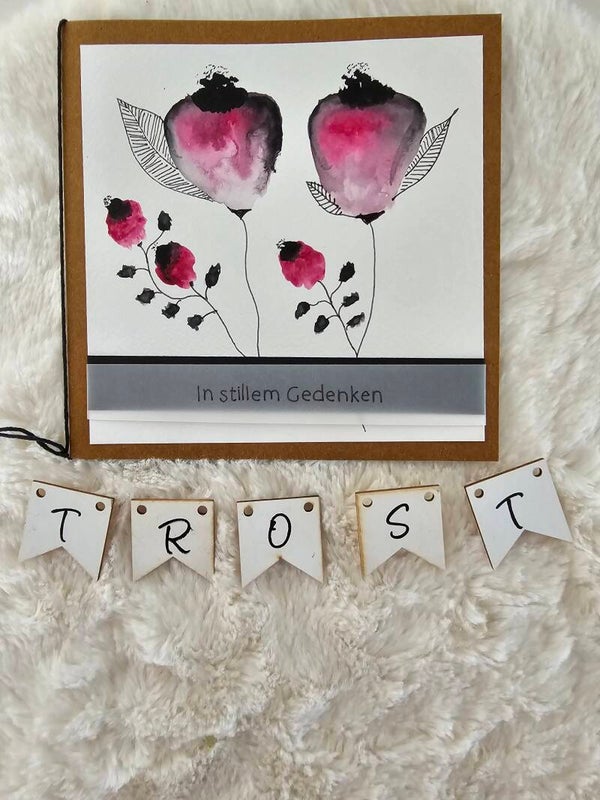 Auf der rechten Innenseite befindet sich ein weißer Einleger aus 300g festen Papier für deinen Gruß Text. Zudem versehe ich meine liebevoll gestalteten Karten immer mit einem zur Karte passendem Band. Bei Bedarf kannst du den „Dekofaden“ auch als Geldhalter nutzen.