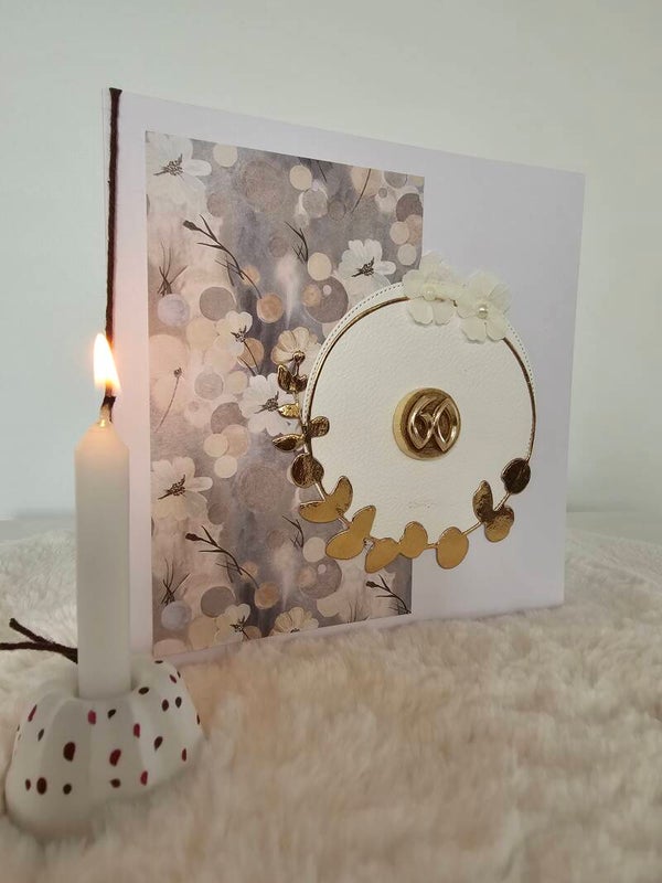 Auf der rechten Innenseite befindet sich ein weißer Einleger aus 300g festen Papier für deinen Gruß Text. Zudem versehe ich meine liebevoll gestalteten Karten immer mit einem zur Karte passendem Band. Bei Bedarf kannst du den „Dekofaden“ auch als Geldhalter nutzen.