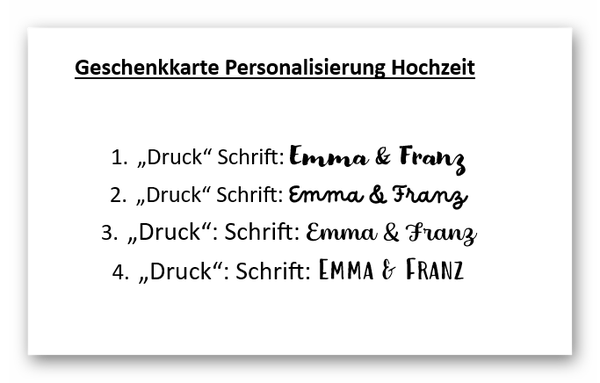 Wenn du die Karte personalisiert haben möchtest, gib hier bitte de Namen des Jubelpaares an. Bitte notiere hier auch die Nummer der gewünschten Schriftart. (siehe Foto)