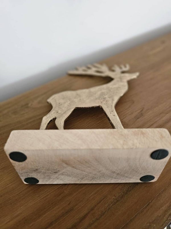 Schöner Hirsch auf Sockel. Der Hirsch ist auf Aluminum fest auf einem Sockel aus Mangoholz. Lass den Hirsch in deine Winterwelt einziehen.