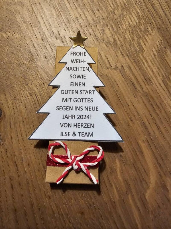 Personalisiert mit Deinem Text auf dem Weihnachtsbaum. Egal ob für Kindergarten, Kegelclub oder Sportverein. Verteil Freude mit den süßen Bäumchem.