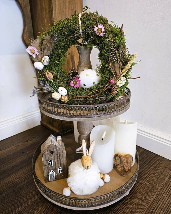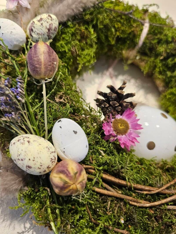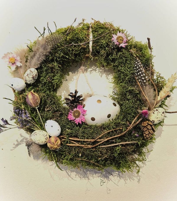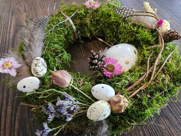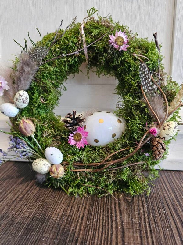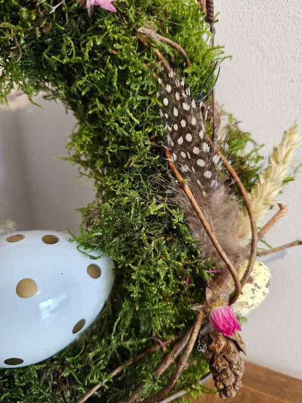 Für dich habe ich schönes, grünes Moos im Wald gesammelt und auf einem klein Strohrömer arragiert. Mit liebevoll ausgewählter Deko wie z.B Dekoeiern, Zweigen, Federn, getrockneten Blüten uvm. wurde der Kranz passend für den kommenden Frühling arrangiert.