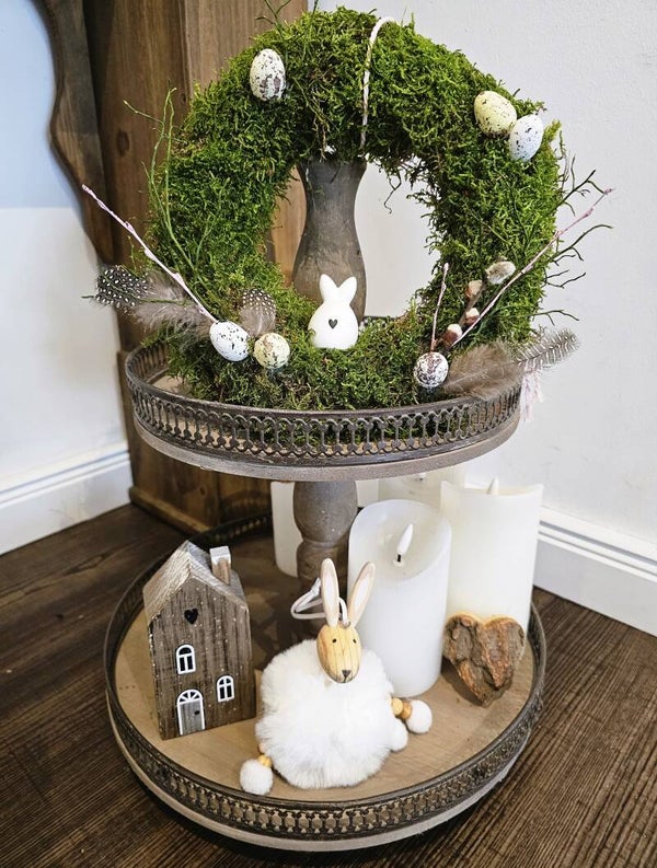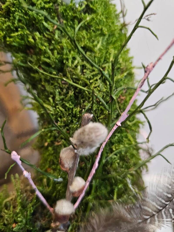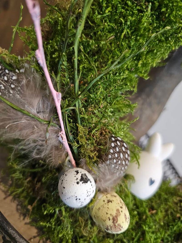 Für dich habe ich schönes, grünes Moos im Wald gesammelt und auf einem klein Strohrömer arragiert. Mit liebevoll ausgewählter Deko wie z.B Dekoeiern, Zweigen, Federn, getrockneten Blüten uvm. wurde der Kranz passend für den kommenden Frühling arrangiert.