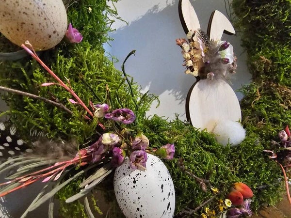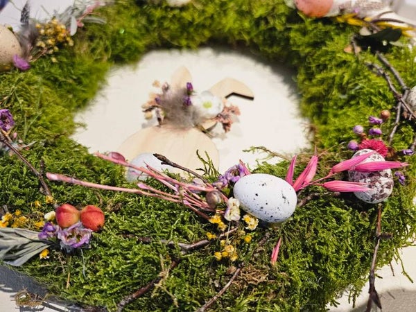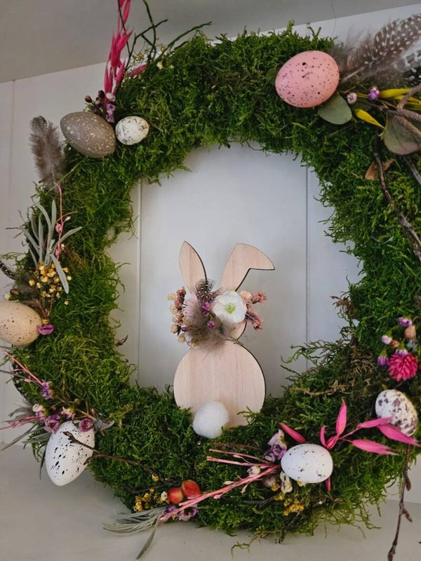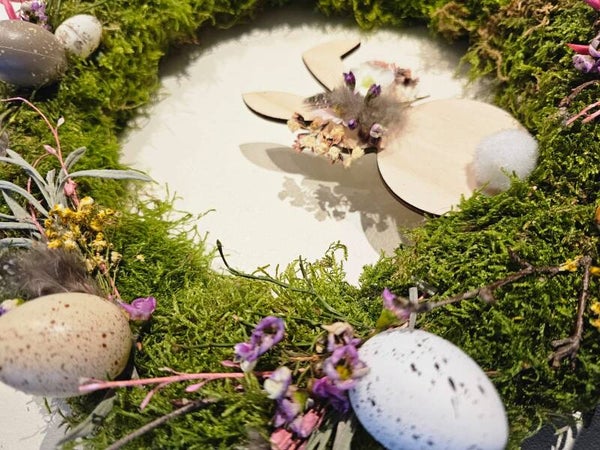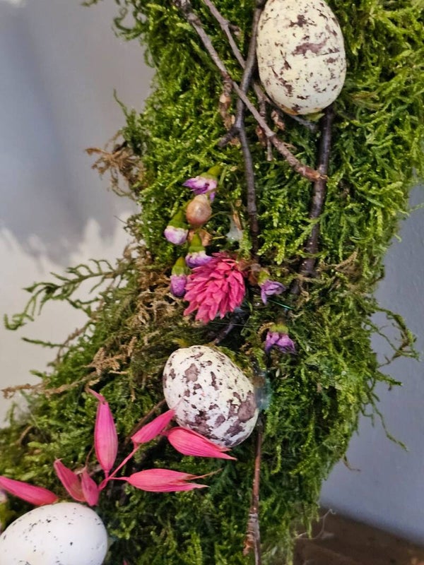 Für dich habe ich schönes, grünes Moos im Wald gesammelt und auf einem Strohrömer arragiert. Mit liebevoll ausgewählter Deko wie z.B Dekoeiern, Zweigen, Federn, getrockneten Blüten uvm. wurde der Kranz passend für den kommenden Frühling arrangiert.