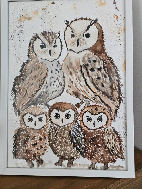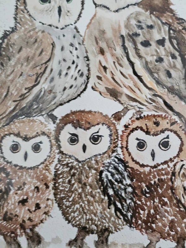 Aquarell einer 5-köpfigen Eulenfamilie.