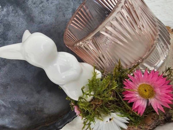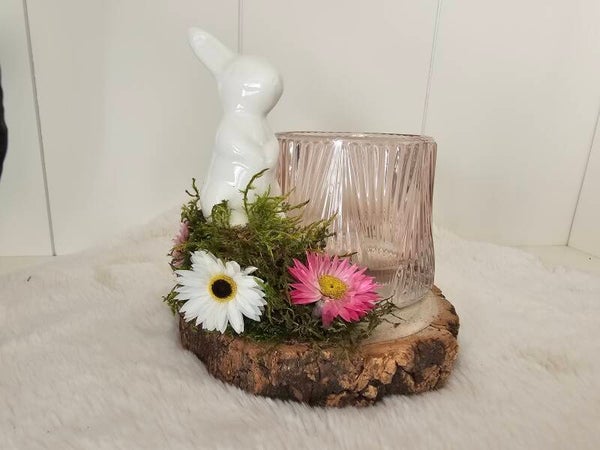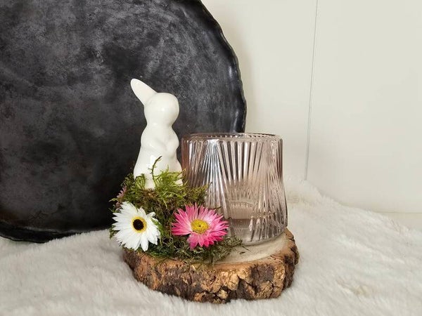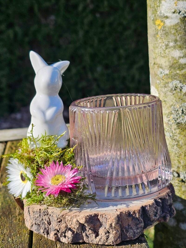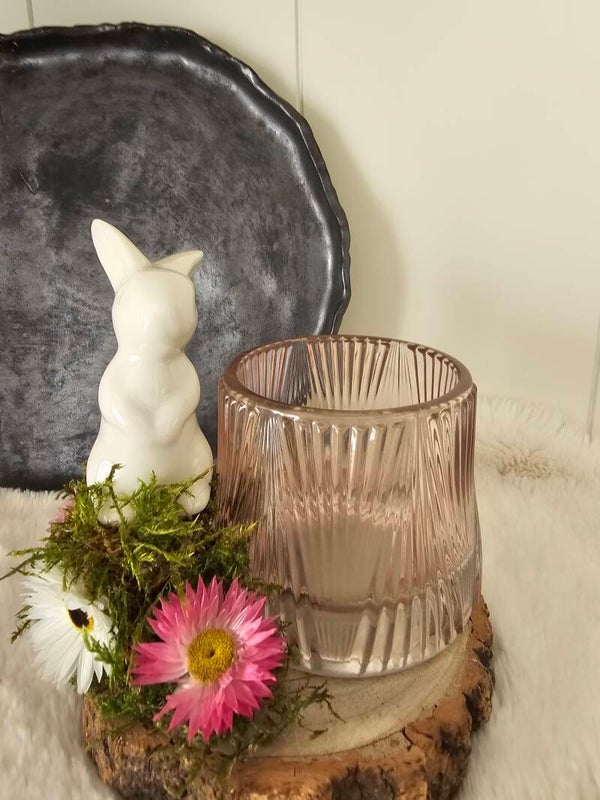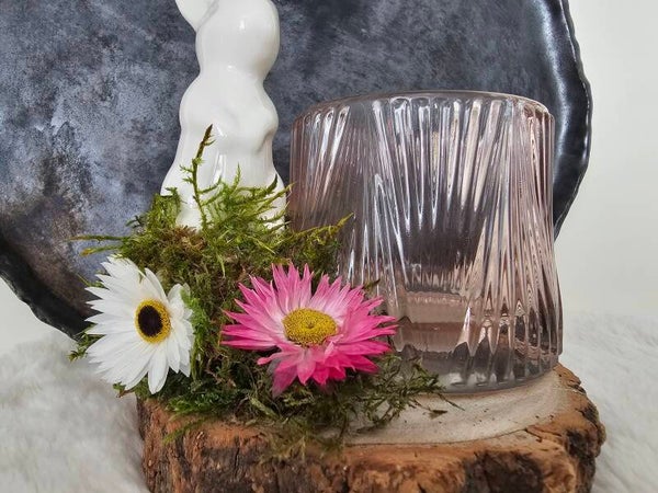 Rosa Kerzenglas haucht in seinem zarten Ton den Frühling auf deinen Tisch. Frisches Moos mit Blüten arrangiert auf einer schönen bearbeiten Holzscheibe. Das kleine Hässchen bewacht das Lichtlein, denn ein kleines Teelicht ist im Lieferumpfang enthalten.