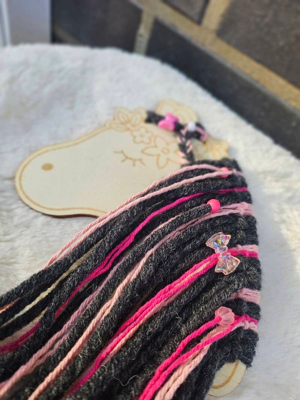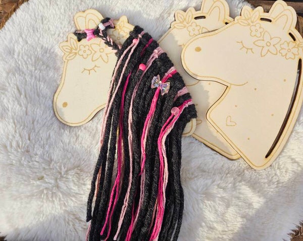 Ob in leuchtendem Pink, schimmerndem Blau oder mit magischem Glitzer – du entscheidest! Und das Beste: Dein Holzpferd kann später sogar als Haarspangenhalter genutzt werden!