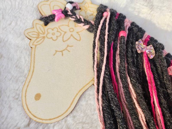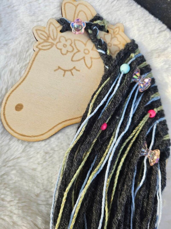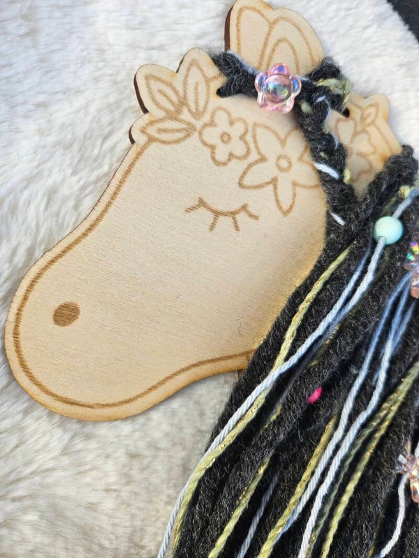 ✨ Alle Materialien sind im Preis enthalten: Holzpferd, Wolle, Fäden, Perlen & Deko.