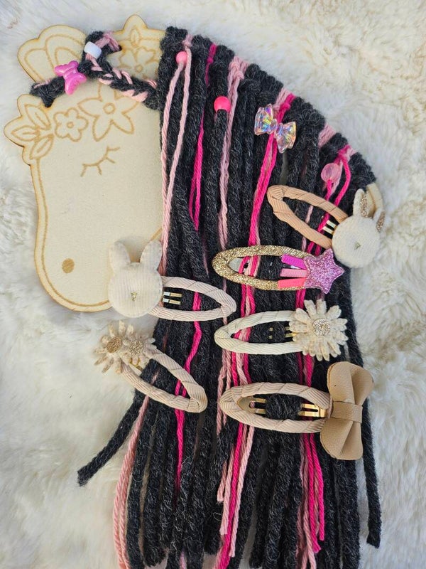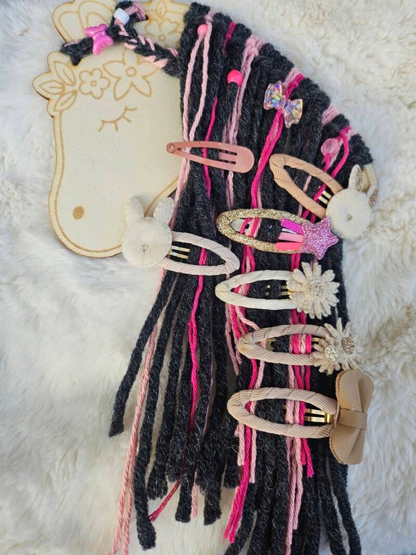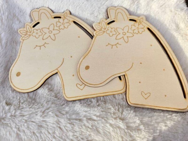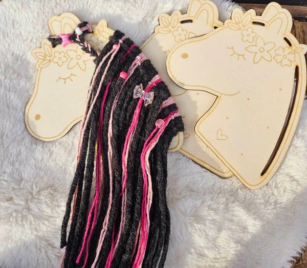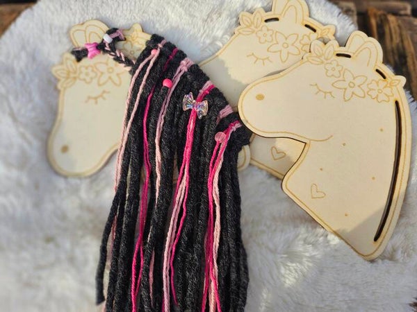 Ob in leuchtendem Pink, schimmerndem Blau oder mit magischem Glitzer – du entscheidest! Und das Beste: Dein Holzpferd kann später sogar als Haarspangenhalter genutzt werden!