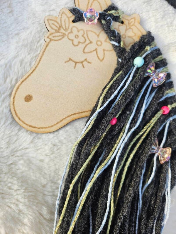 ✨ Alle Materialien sind im Preis enthalten: Holzpferd, Wolle, Fäden, Perlen & Deko.