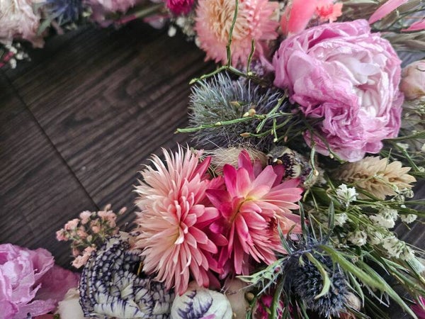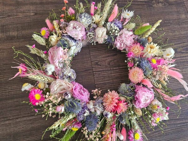 Dieser handgefertigte Kranz erstrahlt in den schönsten Farben und ist mit einer zauberhaften Mischung aus Trockenblumen gestaltet. Eingetrocknete Ranunkeln, filigrane Gräser und viele weitere Blüten verleihen ihm seine natürliche Eleganz. Perfekt als Türkranz, Wanddeko oder Tischschmuck – ein echter Blickfang!