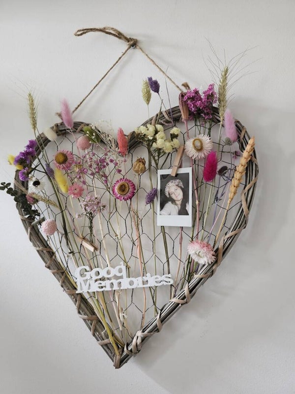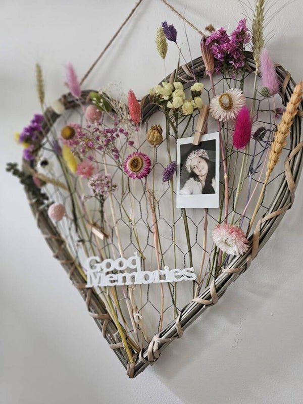 Mit meinem „Blütenbord – Herzgeflüster“ (ca. 35 cm hoch, 38 cm breit) bringe ich ein Stück Poesie in dein Zuhause. Es bietet dir Platz für deine Lieblingsfotos, kleine Notizzettelchen oder auch liebevolle Botschaften. Mit den Klammern kannst du deine besonderen Momente oder Gedanken stilvoll festhalten – alles an einem Ort.