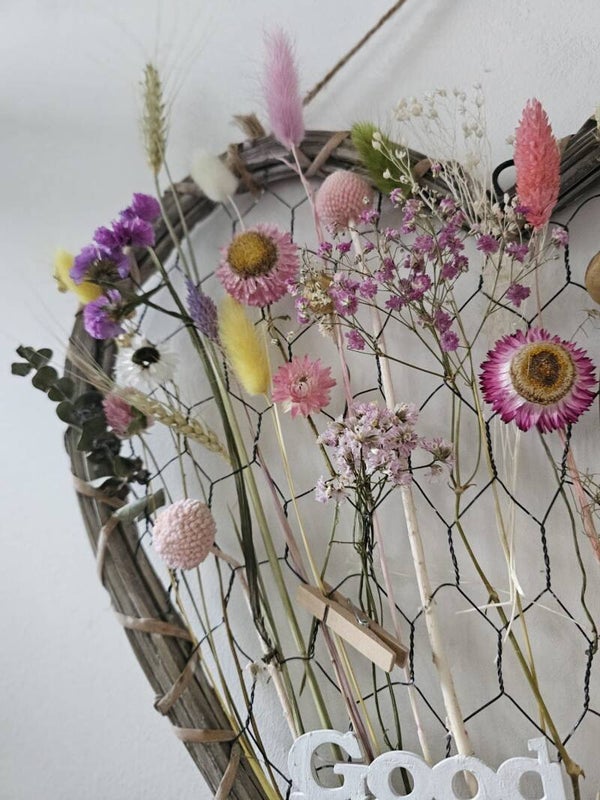 Die Trockenblumen habe ich mit viel Liebe ausgewählt und fest eingearbeitet. Sie machen jedes Blütenbord zu einem einzigartigen Unikat und bringen einen Hauch Natur in deine vier Wände. Dank der vorhandenen Aufhängung kannst du es direkt bei dir zuhause platzieren.