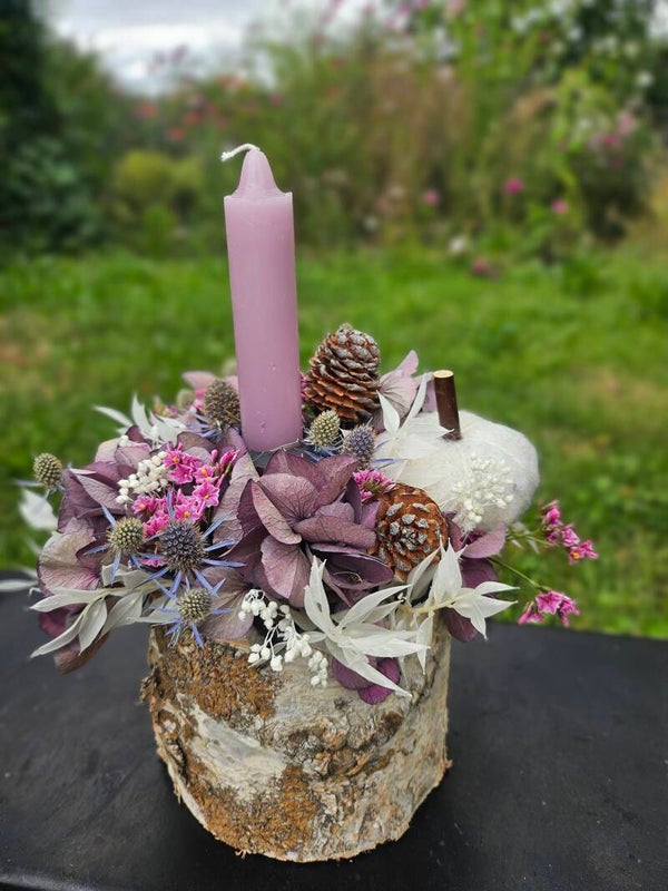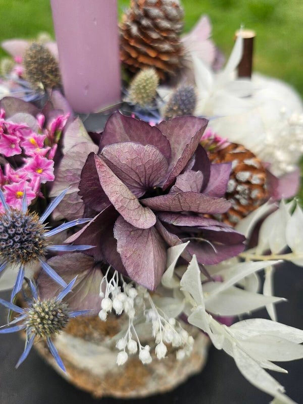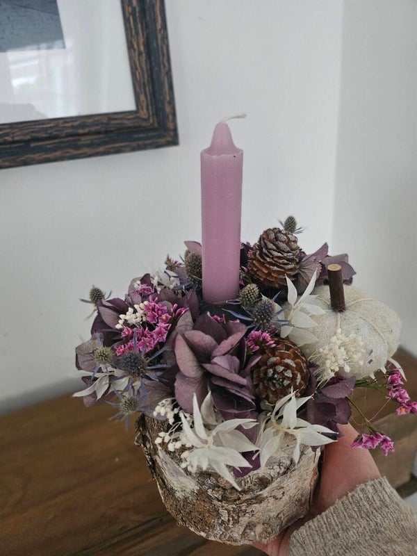 Umrahmt wird das Licht von handverlesenen Trockenblumen, wie zum Beispiel Hortensien, Blau-Diesteln, Strandflieder, Tannenzapfen sowie einem dekorativen Kürbis aus Filz – liebevoll arrangiert und perfekt für die goldene Jahreszeit.