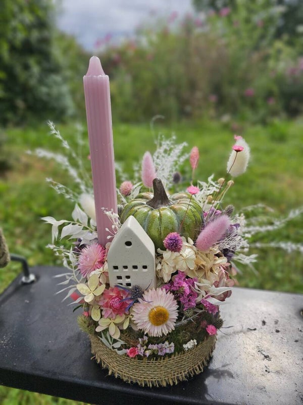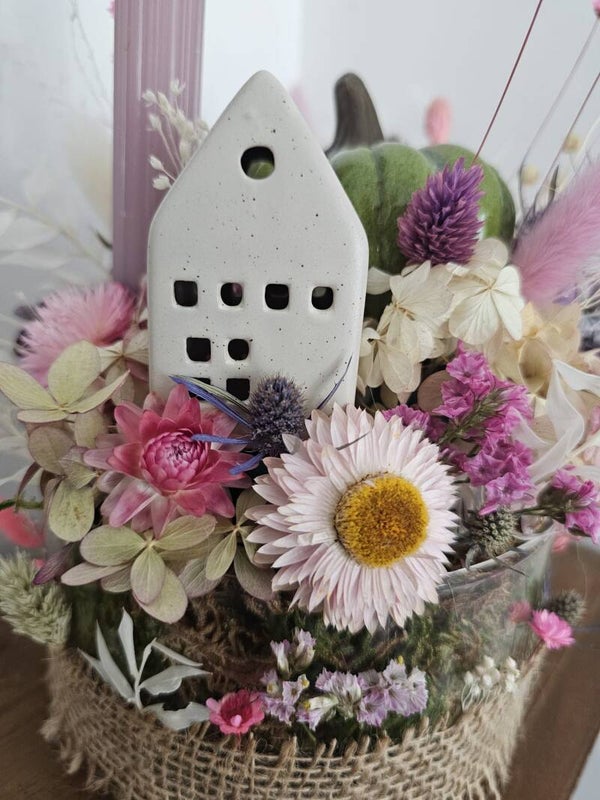 Extras: Keramik-Häuschen, dekorativer Kürbis aus Porzellan, eingearbeitete Blumenwiese aus Trockenblumen