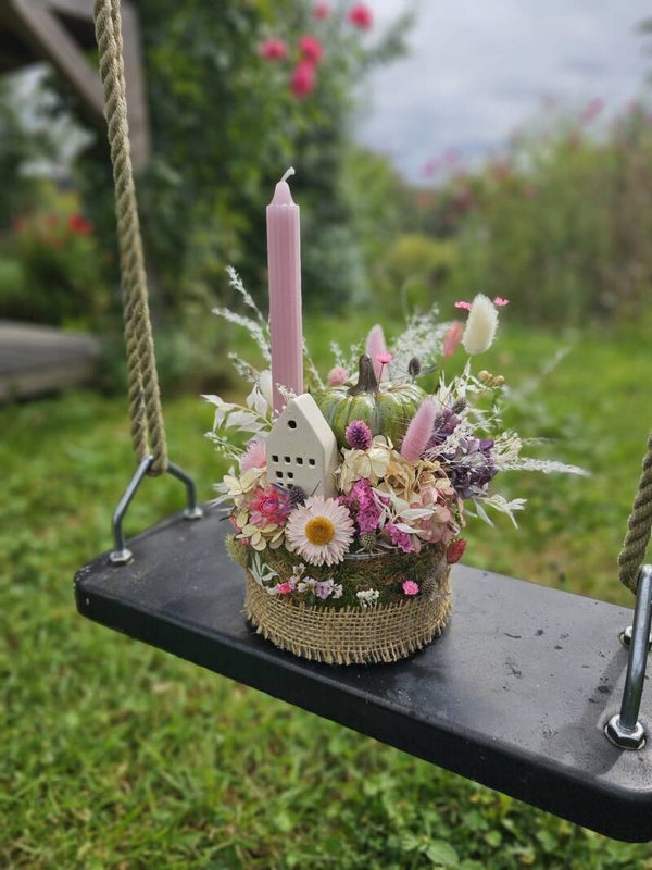 Die große Tafelkerze in Altrosa steckt fest in einem Kerzenhalter und wird von einem kleinen Keramik-Häuschen und einem dekorativen Kürbis aus Porzellan begleitet. Gefertigt in einer Glasschale (Höhe ca. 8 cm, Ø ca. 25 cm), die zart mit Jute umwickelt ist, und gearbeitet auf Steckmasse, sodass die Blumen dauerhaft fixiert sind.
