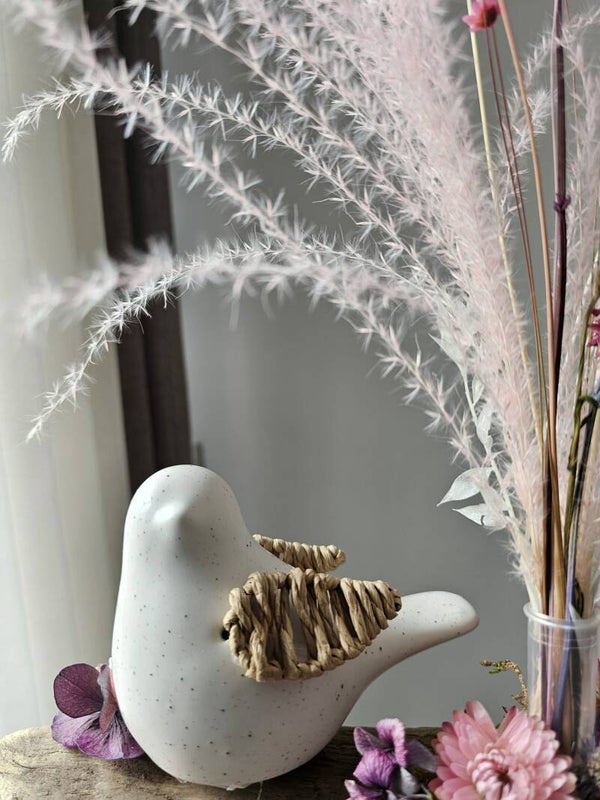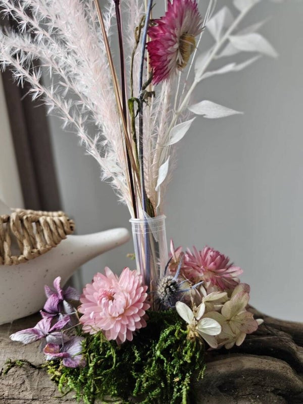 Das Treibholz trägt eine schlichte Vogel-Figur aus Keramik sowie eine Kombination aus Moos, Hortensien und Strohblumen. Ergänzt wird es durch ein fest integriertes Röhrchen, in dem ausgewählte Trockenblumen arrangiert sind. Die Blumen können jederzeit ausgetauscht werden – das Röhrchen lässt sich außerdem mit Wasser befüllen, sodass auch frische Blüten hineingestellt werden können.
