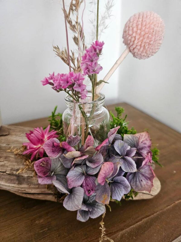 Arrangierung: Trockenblumen, wie z. B. Hortensien, Strohblumen, Phalaris, Gräser