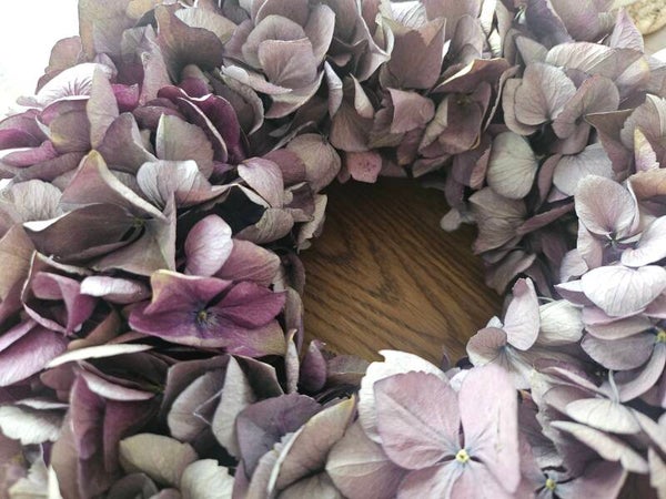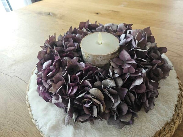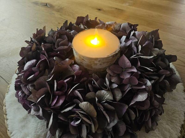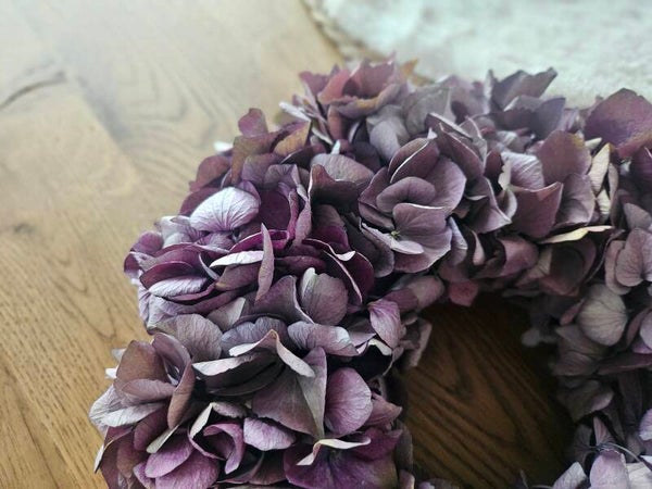 Schlicht, elegant und zugleich eindrucksvoll: Der Trockenblumenkranz „Purpur“ besteht ausschließlich aus handverlesenen Hortensienblüten in intensiven Violett- und Auberginetönen. Die üppige Fülle und die tiefe Farbigkeit verleihen ihm eine würdige Präsenz – ein Arrangement, das ohne weitere Zusätze wirkt.