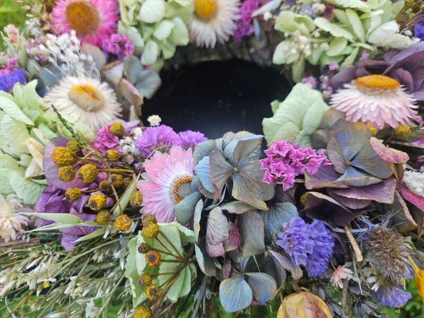 Ein Feuerwerk aus Farben und Formen: Der handgebundene Trockenblumenkranz „Wilder Farbrausch“ vereint die volle Vielfalt der Natur. Leuchtende Strohblumen, üppige Hortensien, Statice, Mohnkapseln, Gräser und viele weitere Blüten tanzen in kräftigem Pink, Violett, Grün, Gelb und Creme. Jeder Blick offenbart neue Details – verspielt, lebendig und voller Poesie.