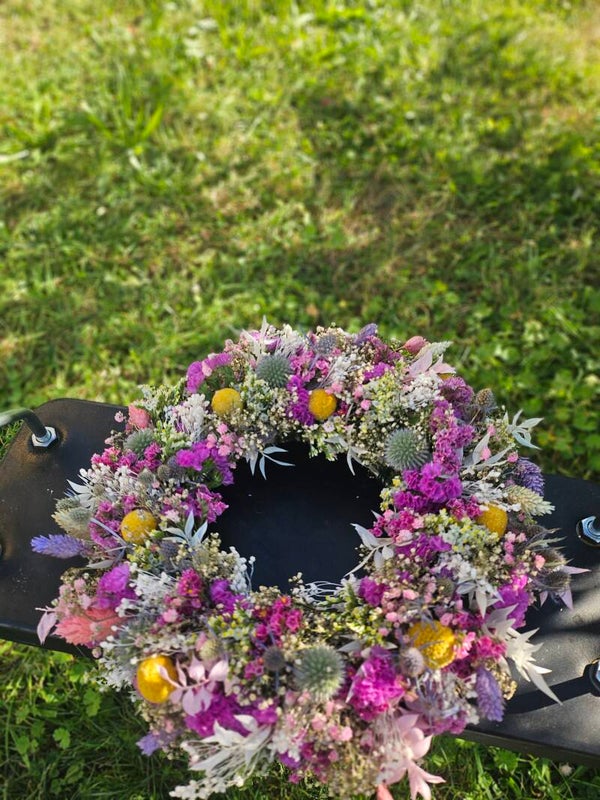 Ein Kranz voller Leuchtkraft und Wärme: Der handgebundene Trockenblumenkranz „Herbststrahlen“ vereint kräftiges Pink, leuchtendes Gelb, Violett und Weiß mit silbrigem Blattwerk und markanten Disteln. Craspedia-Kugeln, Strohblumen, Statice, Phalaris und viele weitere Blüten setzen farbenfrohe Akzente, die diesen Kranz zu einem strahlenden Highlight machen.