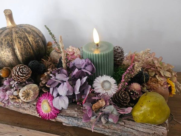Verziert mit Trockenblumen, Zapfen, Beeren, Hortensien, einem goldfarbenen Kürbis und einer echten LED-Wachskerze entsteht ein stimmungsvolles Unikat, das Wärme und Gemütlichkeit ins Zuhause bringt.