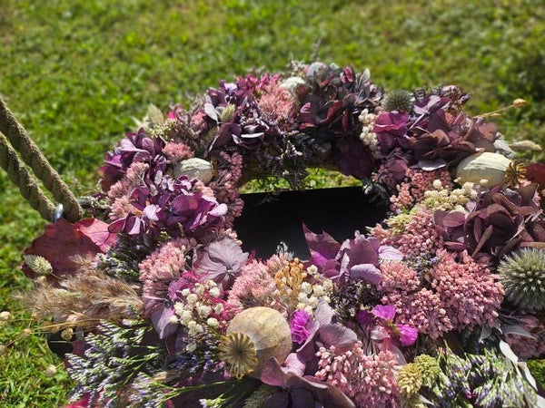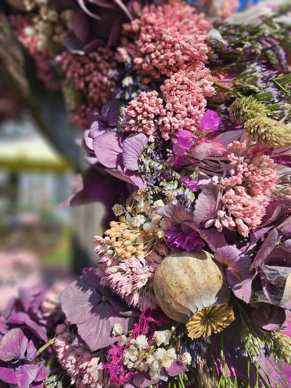 Hortensien, Mohnkapseln, Disteln, Hortensien, Eukalyptus und viele weitere liebevoll ausgewählte Trockenblumen verleihen dem Kranz Fülle und Struktur – jedes Stück wird von Hand arrangiert und ist ein absolutes Unikat.
